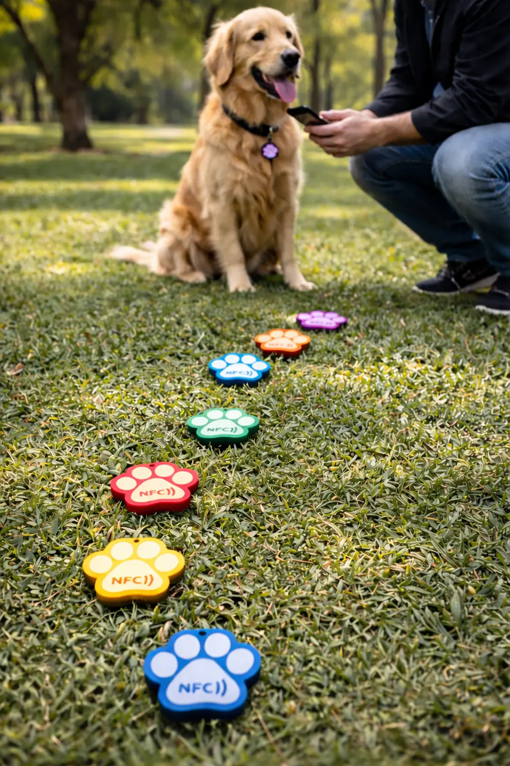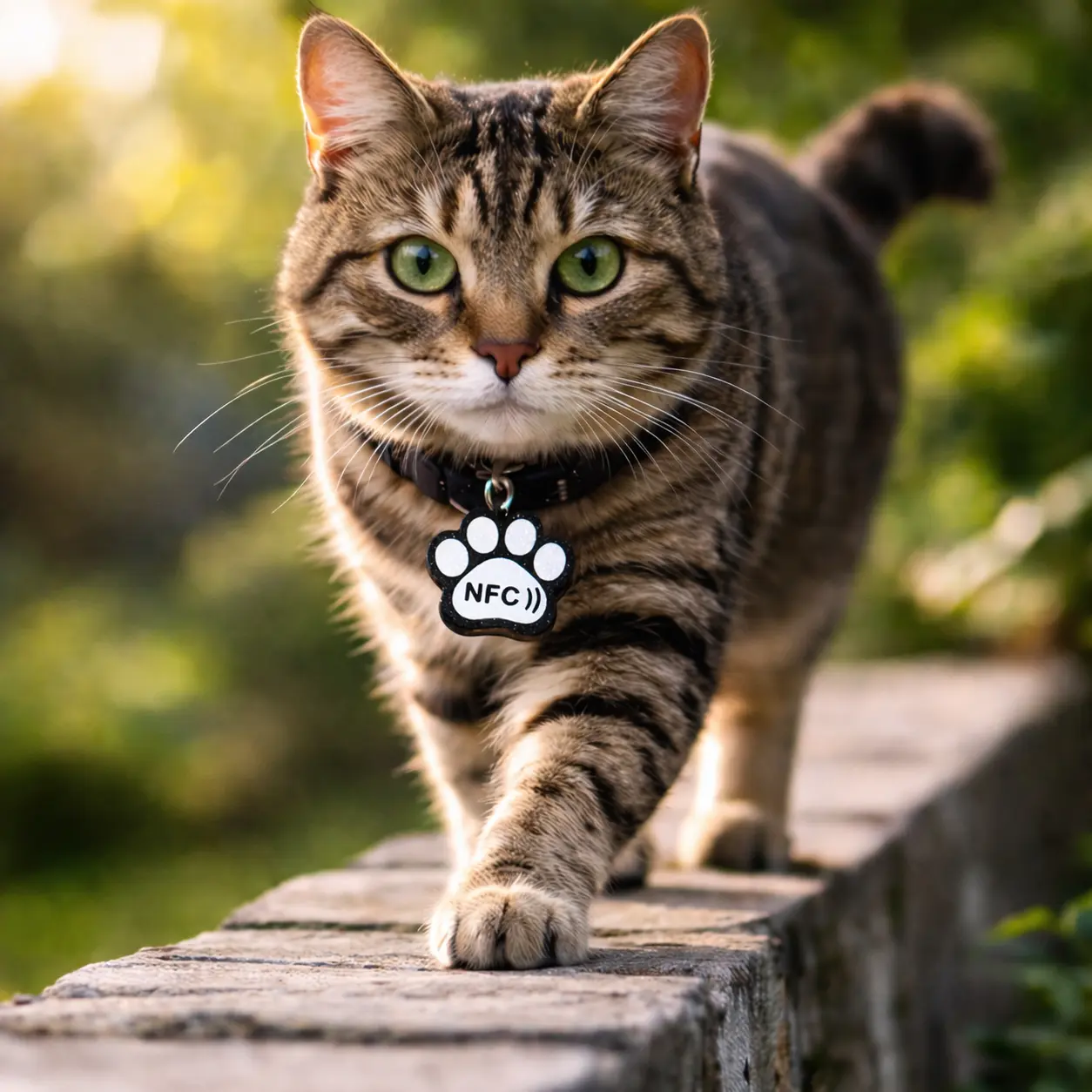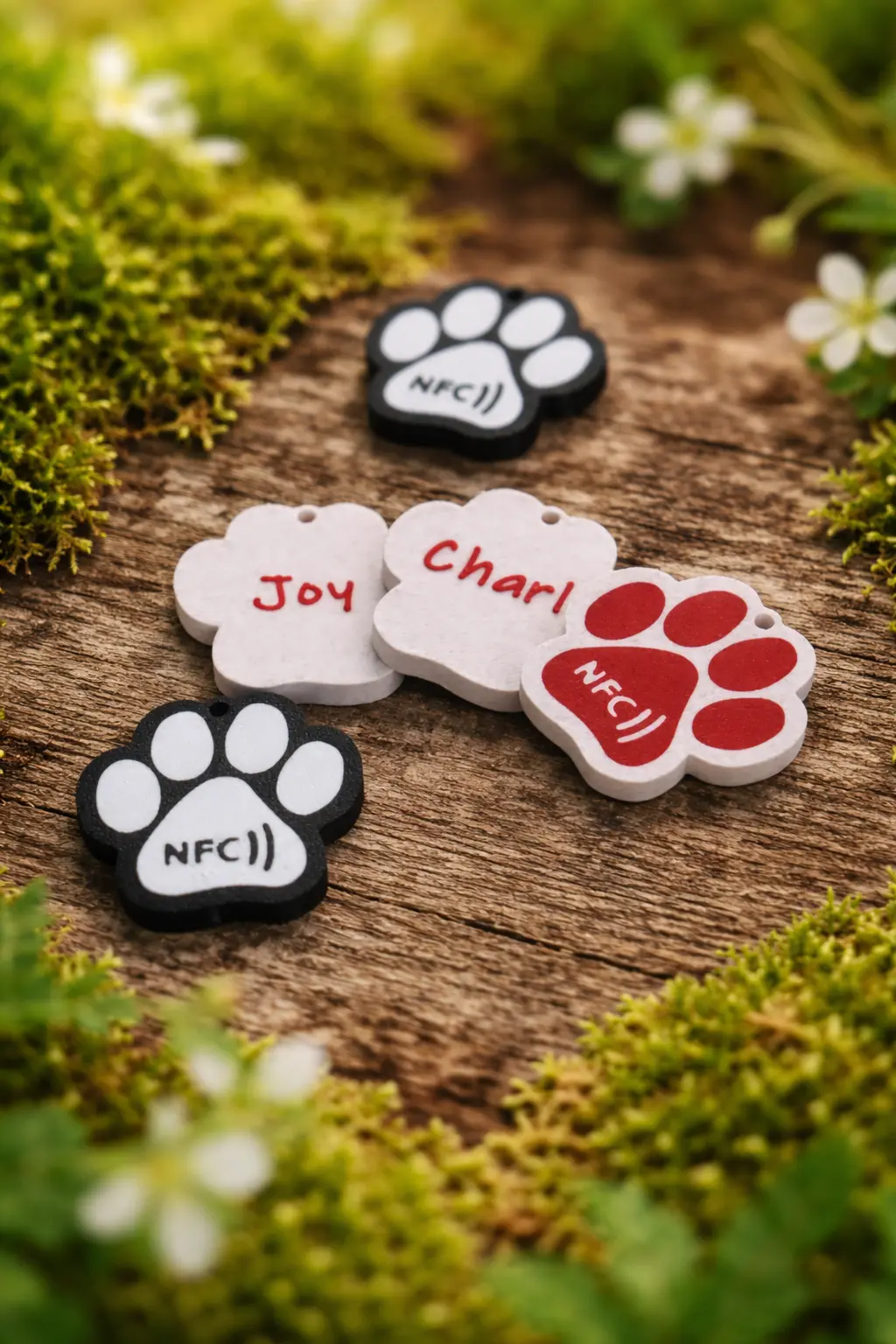 Vodootporni NFC tag za ogrlicu ljubimca. Sam upišeš kontakt besplatnom aplikacijom — radi potpuno offline, bez baterija, bez pretplate, bez web platforme.